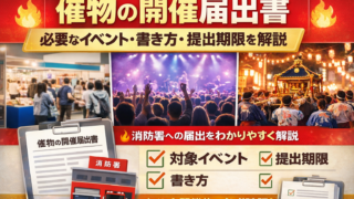各種イベント関連 【5分でわかる】催物の開催届出書|対象イベント・書き方・提出期限を完全解説 催物の開催届出書とは?展示会やコンサートなど多くの人が集まるイベントでは消防署への届出が必要になる場合があります。本記事では、催物の開催届出書の対象イベント、提出期限、書き方、添付書類などを消防実務の視点からわかりやすく解説します。 2026.03.04 各種イベント関連消防関係届出独立・副業