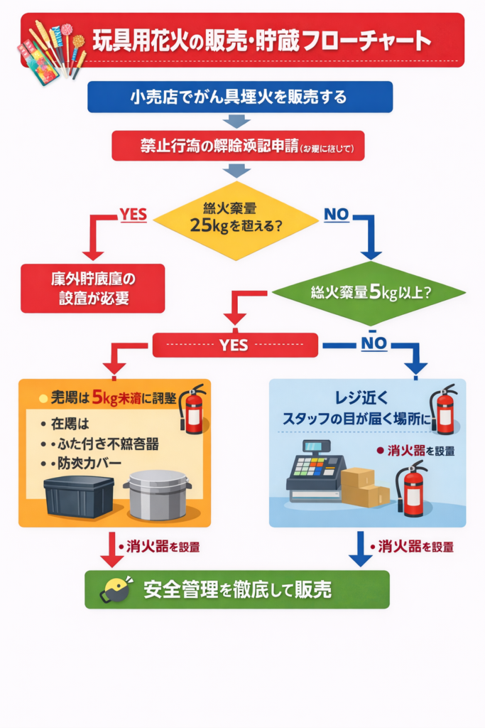 玩具用花火の貯蔵・販売においては、総火薬量に応じて求められる管理方法が大きく変わります。特に重要なのが「25kg」と「5kg」の基準です。