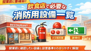 飲食店で必要な消防用設備をわかりやすく解説。消火器、屋内消火栓、スプリンクラー、自動火災報知設備、誘導灯などの設置基準を、面積・階数・構造ごとに整理。開業前に確認したいポイントもまとめています。
