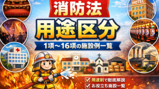 消防法の用途区分1項〜16項を、該当施設例とともに一覧でわかりやすく解説。劇場・飲食店・ホテル・倉庫・複合用途まで網羅し、自分の建物がどの用途に該当するかすぐに判断できます。消防設備の設置基準の理解にも役立つ完全ガイドです。