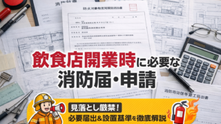 飲食店開業時に必要な消防届出をわかりやすく解説。防火対象物使用開始届出、防火管理者選任届出、消防計画、消防設備の着工・設置届出など、開業前に必要な手続きや提出期限、消防検査のポイントをまとめました。